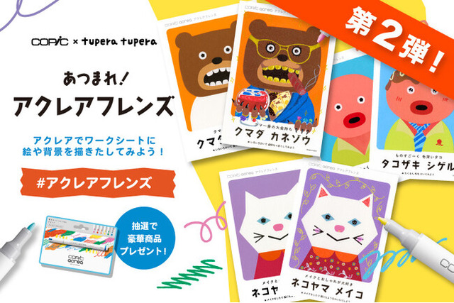 「アクレアフレンズ」は人気絵本作家tupera tupera氏が本企画のためにデザインしたオリジナルキャラクター。水性マーカーの「コピック アクレア」で小物や衣装、背景などを描き足して楽しむことができるように、アクレアフレンズを用紙にプリントした特製ワークシートを作成しました。