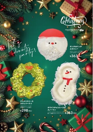 この度『JACK IN THE DONUTS』の全店で、クリスマス商品を11月8日(金)~12月25日(水)で期間限定販売いたします。クリスマスを象徴する、サンタクロース、雪だるま、クリスマスリースをモチーフにした3商品がクリスマス気分を華やかに彩ります。ご家族やご友人でクリスマスをお楽しみいただける商品になっております。