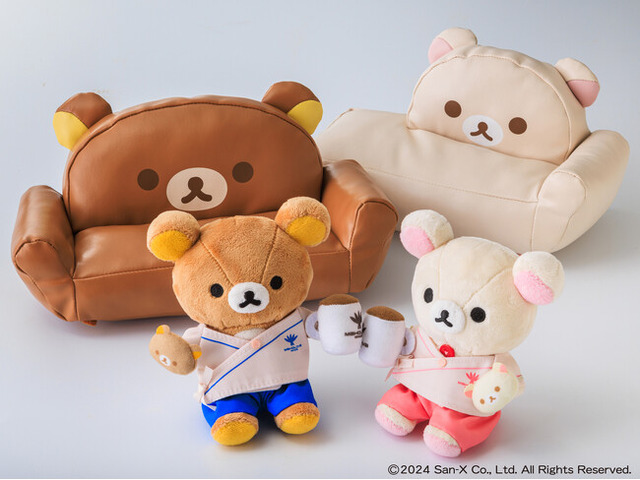 ▲宿泊者と同じ館内着を着たリラックマたちとソファの、新デザインぬいぐるみセット(左:リラックマルーム用、右:コリラックマルーム用)
