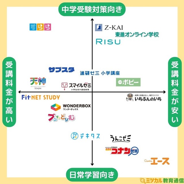 小学生向け通信教育を「受講料金が高い・安い」「中学受験対策向き・日常学習向き」で分類したポジショニングマップです。