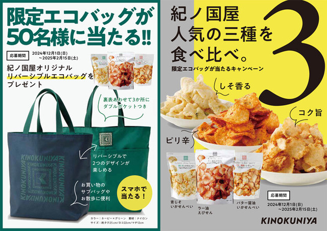 株式会社紀ノ國屋は、2024年12月1日 (日)から2025年2月15日(土)までの期間、「ラー油えびせん・いかせん食べ比べセット」をご購入いただいたお客さまを対象にした「紀ノ国屋人気の三種を食べ比べ(限定エコバッグが当たる)キャンペーン」を開催中です。