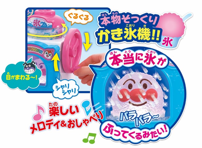 『シャリシャリけずろう アンパンマン ゆめのレインボーかき氷屋さん』は、アンパンマンとなかまたちの楽しいおしゃべりとともに、かき氷屋さんごっこが楽しめる商品です。シャリシャリと手動で氷を削るような感覚と音、そして出来上がったかき氷がキラキラ光る演出によって、本物のかき氷を作っているようなワクワク感や、かき氷の白色がシロップをかけると別の色に変わる驚きを楽しむことができます。