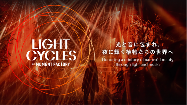 LIGHT CYCLES KYOTOは、自然への敬意を表し、人と自然の関係性を考察する試みです。世界最高峰のマルチメディア・スタジオMoment Factoryが手掛ける、私たちがまだ知らない植物たちの世界や、まったく新しい植物の魅力を体験できる没入型エンターテインメント。開園100周年を迎えた京都府立植物園で、光と音を通じて植物たちの声を可視化し、次世代に向けて自然との深いつながりを育む機会を創出します。