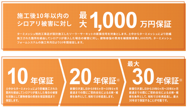 なお、2000年の発売以降、累計約9,000棟の販売実績があり、ターミメッシュが防蟻施工された箇所からのシロアリの侵入被害は0棟という高い信頼実績を誇ります。長い期間住まわれる住宅において、住まい手の方への更なる安心を提供いたします。保証制度の詳細は、カネカソーラーサーキットのお家契約工務店、または株式会社カネカソーラーサーキットのお家にお問合せください。