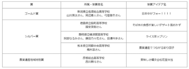 受賞アイデアは以下のとおりです。ゴールド賞受賞アイデアは、期間限定で東京都内のレストランでメニューとして提供し、受賞者をメニュー提供レストランも訪れる東京2日間の旅にご招待します。シルバー賞、農業遺産地域特別賞の受賞者には、副賞として農業遺産地域の特産品詰め合わせを贈呈いたします。