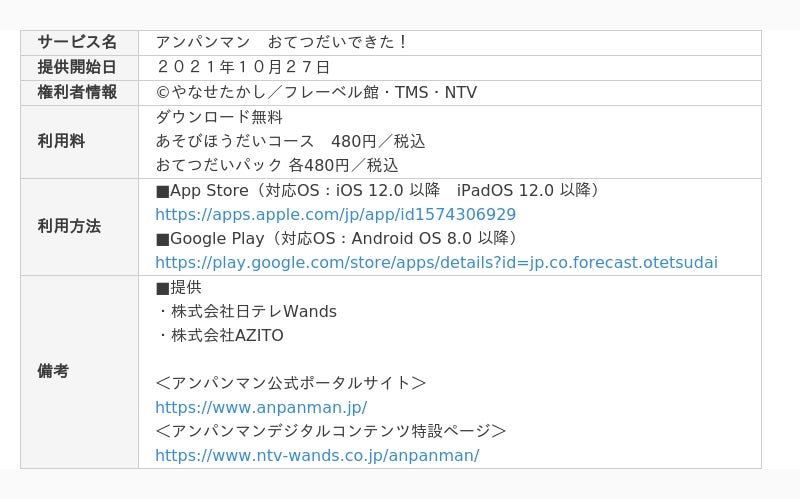 日テレWands(本社:東京都港区、代表取締役社長:鈴木 重利)は、アンパンマンの幼児向け知育アプリ「アンパンマン おてつだいできた!」のリニューアルを実施致しました。