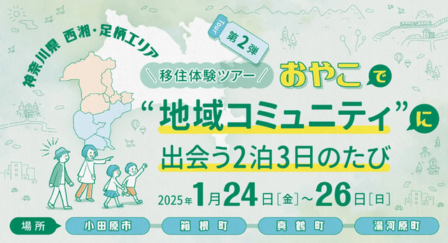 県西地域の2市8町(注記)で構成されている、西湘・足柄エリア。都心に近い位置にありながら、豊かな自然に恵まれ、公園などのレジャースポット、子育て施設も充実しており、都心への通勤と自然豊かな場所での子育てを両立して叶えられる当該エリアでの移住体験ツアーを実施します。第2弾は西湘エリアで2泊3日のツアーを実施します。