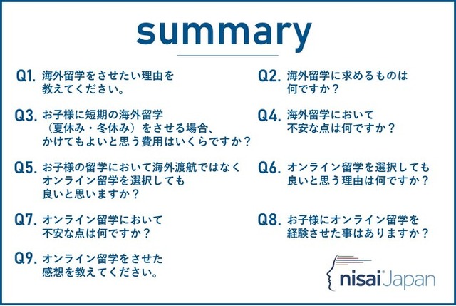 今回の調査では、子供の海外留学やオンライン留学に対する保護者の意識と期待、不安、そして実際の満足度が浮き彫りになりました。以下に全体の概要を簡潔にまとめます。