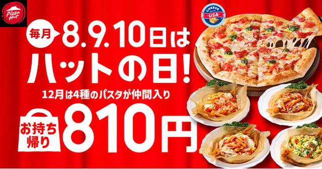 日本ピザハット株式会社(代表取締役社長:篠崎 幸男、本社:神奈川県横浜市、以下:ピザハット)が展開する世界最大級のピザチェーン「ピザハット」は、毎月8日・9日・10日を「ハットの日」として、ピザハットの商品をお持ち帰り810円でご提供するキャンペーンを実施しております。