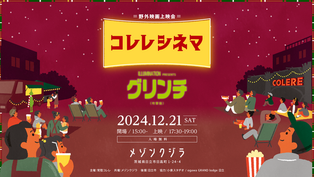 常陸コレレが開催する野外上映会・コレレシネマは、メゾンクジラ(茨城県日立市日高町)を会場に『グリンチ(吹替版)』の上映とクリスマスマーケットを開催します。また、開催リリースに伴い、常陸コレレのロゴマークとタグラインを刷新したのでお知らせいたします。
