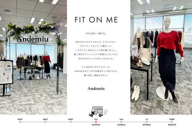 Andemiuは、多様な年齢・既婚独身問わず「働く女性」を応援し、現代を生きる女性達のリアルなライフスタイルをご提案するブランドです。出張ショールーミングストア「FIT ON ME」は、時短・便利・好印象…働く女性のニーズにお応えし、女性の活躍をファッションの力でサポートする様々なコンテンツを組み合わせ、企業向けにご提供しています。