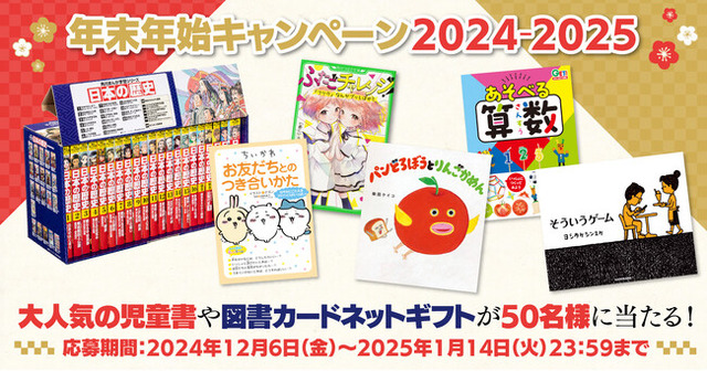 株式会社KADOKAWA(本社:東京都千代田区、取締役 代表執行役社長 CEO:夏野剛)は、児童書サイト「ヨメルバ」にて、「パンどろぼう」シリーズや「ちいかわ」の書籍、「マインクラフト」の学習ドリルセット、『角川まんが学習シリーズ 日本の歴史』、「角川の集める図鑑GET!」シリーズ、「ふたごチャレンジ!」(角川つばさ文庫)シリーズ9冊セットなど、人気作品の豪華セットが当たる年末年始キャンペーンを2024年12月6日(金)より開始しました。