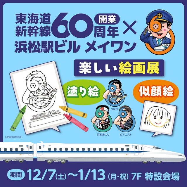 「青葉幼稚園(浜松)」の年少組・年中組・年長組の約200名の皆さんが描いた似顔絵や、東海道新幹線開業60周年を記念し、浜松市出身の絵本作家「鈴木のりたけ」さんがデザインされた浜松にゆかりのあるミニロゴ(うなぎ、浜松まつり、ピアニスト)の塗り絵を新幹線に模したパネルに展示致します。未来に向けて、青葉幼稚園の皆さんの思いを乗せてメイワンから出発します。