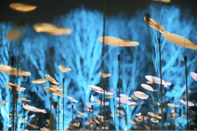 広々とした芝生のグリーンヒルに設置された2000本の風見鶏によるモビールスケープ。風に揺られると、日中は陽の光を受けてキラキラと輝き、夜は幻想的な灯りで園内を彩る、小松 宏誠氏作の自然を可視化したアート。