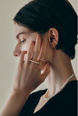 顔まわりに優しく寄り添う、左耳用のイヤーカフ。淡水パールと地金の2つをレイヤードしているかのように見え、スタイリング不要で耳元に華やかさをプラスしてくれます。
