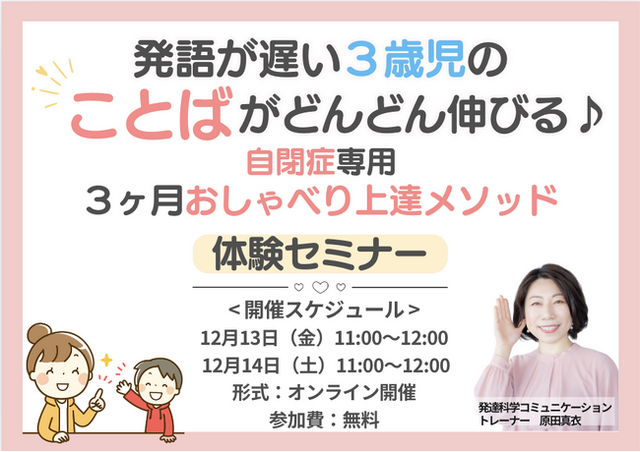 株式会社パステルコミュニケーション(本社:東京都豊島区、代表取締役吉野加容子)代表の吉野加容子が開発した、親子のコミュニケーションをスムーズにして子どもの発達を加速させる「発達科学コミュニケーション」講師・原田真衣による、「発語が遅い3歳児のことばがどんどん伸びる♪自閉症専用3ヶ月おしゃべり上達メソッド~無料体験セミナー~」お申し込み開始しました。開催日は12月13日(金)、12月14日(土)です。詳細・お申し込みはこちら<https://www.agentmail.jp/form/ht/57656/1/>