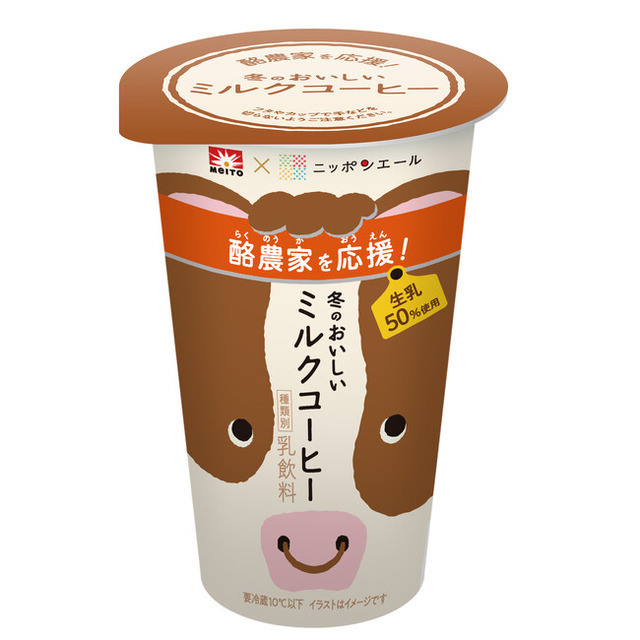 【内容】生乳を50%使用したミルクコーヒーです。挽きたてのコーヒー豆を牛乳にそのまま浸すミルク抽出製法を採用し、10℃前後の低い温度で2時間じっくり丁寧に抽出することにより、コーヒーの味わいを引き出しました。パッケージはかわいらしい牛のイラストをデザインし、メイトー×ニッポンエールのロゴ(※1)を配置しています。