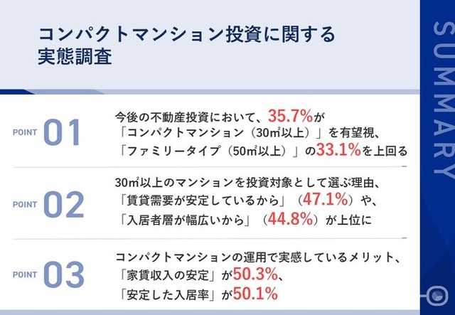 まず、投資用マンションを選ぶ際の重視点として、「将来的な資産価値」(59.2%)が最も多く、次いで「現在の利回り」(52.7%)、「立地条件」(51.1%)という結果となりました。30平方メートル 以上のマンションを投資対象として選んだ理由では、「賃貸需要が安定しているから」(47.1%)、「入居者層が幅広いから」(44.8%)が上位となっており、実際の運用においても「家賃収入の安定」(50.3%)、「安定した入居率」(50.1%)というメリットを実感している結果が明らかになりました。また、今後有望な不動産投資対象としても「コンパクトマンション(30平方メートル 以上)」が35.7%で最も多く選ばれ、「ファミリータイプ(50平方メートル 以上)」(33.1%)を上回る結果となっています。
