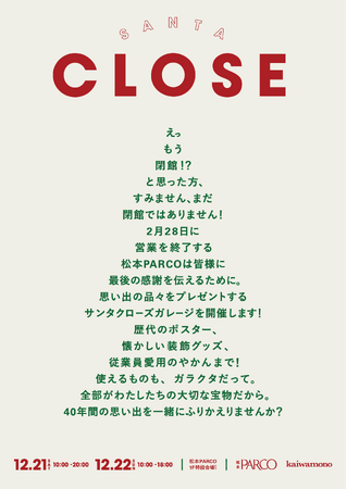 松本PARCO(所在地:長野県松本市中央1丁目)と、会話が生まれる、あたらしい買い物体験をつくるクリエイティブチーム“kaiwamono(カイワモノ)”は、松本PARCO閉館前の最後のクリスマスイベントとして、館内の思い出の品々をプレゼントする「SANTA CLOSE GARAGE」を12月21日(土)・22日(日)の2日間開催します。