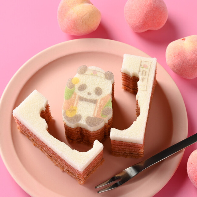 桃太郎になりきった、かわいいパンダの型ぬきバウムができました。きびだんごをお腰につけて、鬼退治にいくところ。桃の果汁がすっきりと爽やかに香る、まろやかな甘さのもも味です。