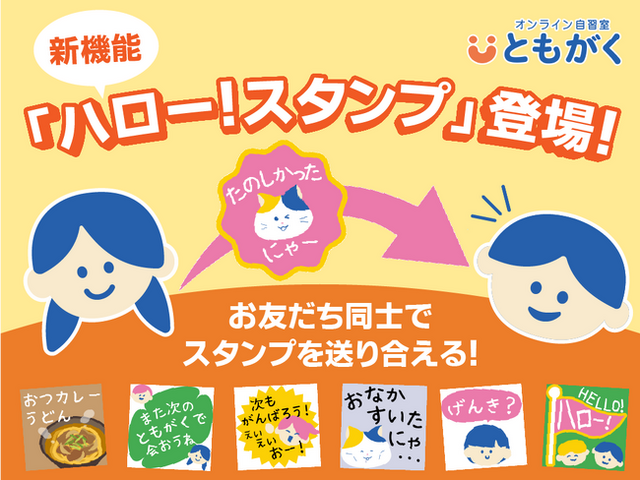 株式会社新学社(本社:京都市/代表取締役社長:山本 伸夫)は、オンライン自習室「ともがく」にて、子ども同士がスタンプを送り合える新機能「ハロー!スタンプ」をリリースしました。