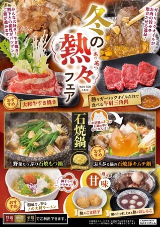 コロワイドグループの株式会社アトム(本社:神奈川県横浜市、代表取締役社長:田中公博)は 「カルビ大将・がんこ炎」各店舗にて2024年12月10日(火)より「冬の熱々フェア」を開始いたします。