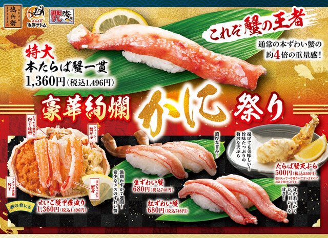 コロワイドグループの株式会社アトム(本社:神奈川県横浜市、代表取締役社長:田中公博)は「にぎりの徳兵衛」「海鮮アトム」「海へ」の各店で2024年12月17日(火)~2025年1月初旬の期間限定で「豪華絢爛 かに祭り」を実施します。