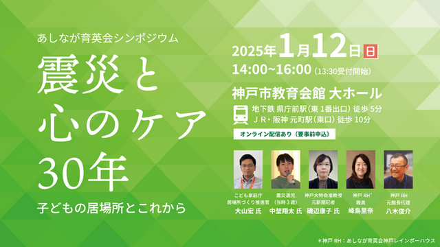 一般財団法人あしなが育英会(本部:東京都千代田区、会長:玉井義臣、以下本会)は、阪神・淡路大震災から30年を迎えるにあたり、2025年1月12日(日)に神戸市教育会館大ホールで、シンポジウム「震災と心のケア30年 ~子どもの居場所とこれから~」を開催します。