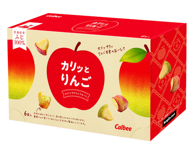 「カリッとりんご」は2020年12月より青森県内のお土産店とカルビーのアンテナショップ「カルビープラス」の一部店舗において店舗限定で先行テスト販売を実施してきました。お客様から大変ご好評をいただき、毎年販売数も大きく伸長したことから、この度パッケージをリニューアルして青森県全域で販売する運びとなりました。パッケージには、青森県津軽地方に伝わる伝統的な刺し子「こぎん刺し」のオリジナル模様を採用しています。地域に根付いたものづくりで青森の魅力を伝える助力になることを目指します。