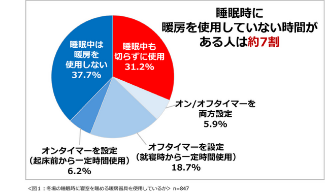 「冬場の睡眠時に寝室を暖めるための暖房器具(エアコン、オイルヒーターなど)を使用しているかという質問をしたところ、37.7%の人が「就寝中は暖房を使用しない」と回答し、オン/オフタイマーの使用を含めると68.5%の人が睡眠時に暖房を使用していない時間があることが判明しました。(図1)