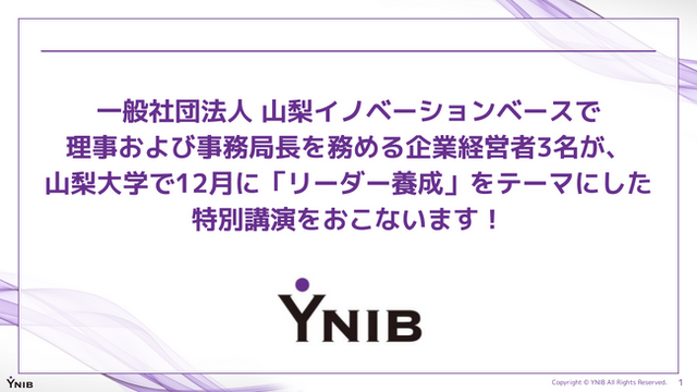 山梨にゆかりのある起業家による、山梨の若手アントレプレナー(起業家や起業家精神を持つ人)を応援するためのネットワークである一般社団法人山梨イノベーションベース(以下、YNIB)にて理事および事務局長を務める企業経営者の3名が、2024年12月12日・19日・26日の3日間にわたり、山梨大学で特別講演をおこないます。
