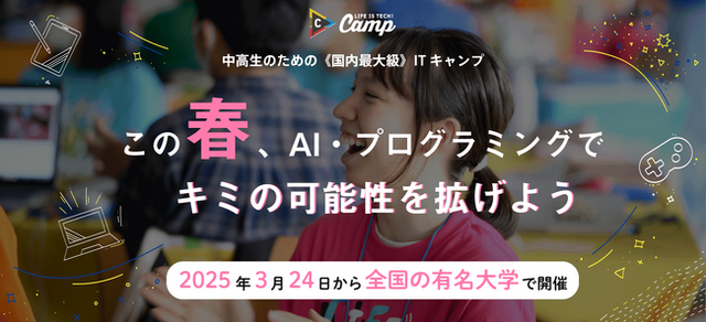 中学生・高校生向けのプログラミング教育サービス事業を手がけるライフイズテック株式会社(本社:東京都港区、代表取締役CEO:水野 雄介)は、2025年3月24日(月)~4月6日(日)の期間、中高生向けプログラミング・AIキャンプ「Life is Tech ! Spring Camp 2025」を開催します。本プログラムについて、参加者の募集を開始します。