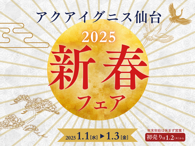 アクアイグニス仙台(仙台市若林区藤塚/運営:仙台reborn株式会社)は年末年始も休まず営業いたします。元旦からは新春フェアとして「初日の出」営業、豪華景品が当たる「新春ガチャ」や初売りを開催いたします。年末年始はご家族そろってアクアイグニス仙台へ。最高の新年を迎えましょう!
