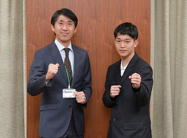 令和6年12月12日(木曜日)、高槻市立第十中学校3年生の荒木太陽さんが高槻市役所を訪問し、12月22日(日曜日)に和歌山県で開催される「第33回近畿中学校空手道選手権大会」の組手部門に出場することを八十祐治副市長に報告しました。