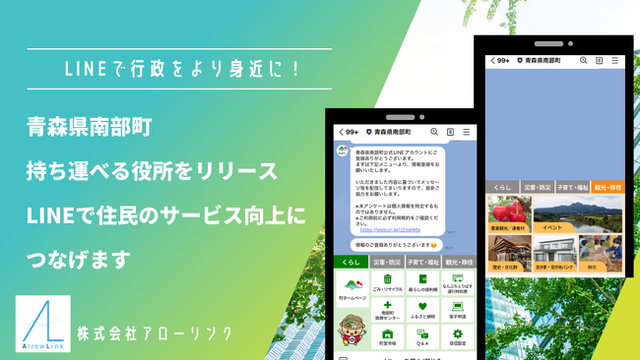 この度、株式会社アローリンク(本社:兵庫県神戸市中央区雲井通4-2-2 マークラー神戸ビル4階、代表取締役:蓬莱和真)は、青森県南部町(町長:工藤祐直)が「持ち運べる役所」としてLinyを活用し、青森県南部町LINE公式アカウントを開設したことをお知らせします。