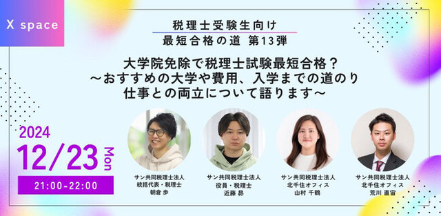 サン共同税理士法人(本社:東京都港区、代表社員: 朝倉 歩)は、 2024年12月23日(月)21:00より「税理士試験 最短合格の道」と題し、最短で試験に合格する勉強方法やモチベーション維持方法などをX(旧Twitter)スペースにてお伝えいたします。今回は、採用担当で税理士の近藤 昴と北千住オフィス 山村 千鶴、荒川 直宙と大学院免除のポイントをお伝えします。
