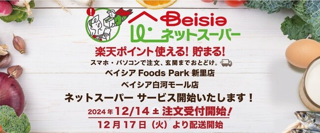 株式会社ベイシア(本社:群馬県前橋市、代表取締役社長:相木孝仁)は、楽天グループ株式会社(以下「楽天」)が提供するネットスーパーのプラットフォーム「楽天全国スーパー」内に出店する「ベイシアネットスーパー」において、ベイシアFoods Park新里店・ベイシア白河モール店からの配送を2024年12月17日(火)より開始いたします。今回のサービス開始に伴い、群馬県では世帯数の過半数をカバー、前橋市では約90%をカバーいたします。