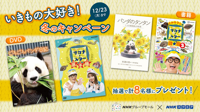 株式会社NHKエンタープライズ(本社:東京都渋谷区)は、2024年12月20日よりDVDの発売を開始する「ギョギョッとサカナ★スター選手権」「ごろごろパンダ日記」を記念して、番組関連のDVD・書籍が当たるプレゼントキャンペーン「いきもの大好き!冬のキャンペーン」を「NHKグループモール」と「NHKスクエア」のX(旧Twitter)で12月13日~23日まで実施します。