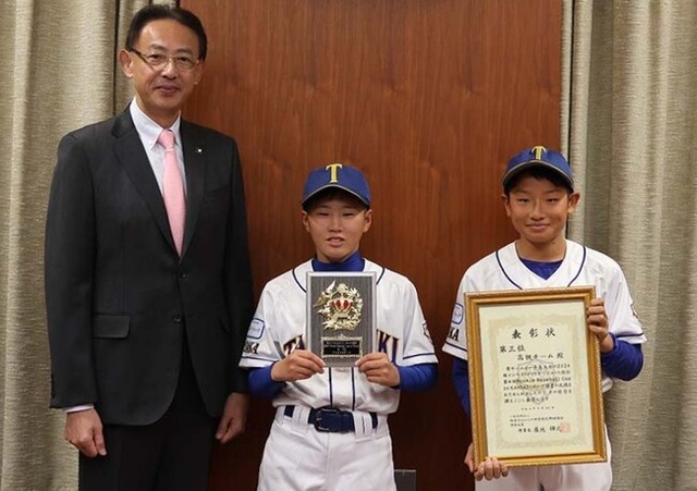 令和6年12月13日(金曜日)、硬式少年野球チーム「高槻リトルシニア」に所属する高槻市立芝谷中学校1年の篠原理生さんと同第六中学校1年の小林湊さんが市役所を訪問し、中学1年生対象の全国大会「JAL沖縄第4回Rookie Baseball Cup」に関西代表として出場することを濱田剛史市長に報告しました。