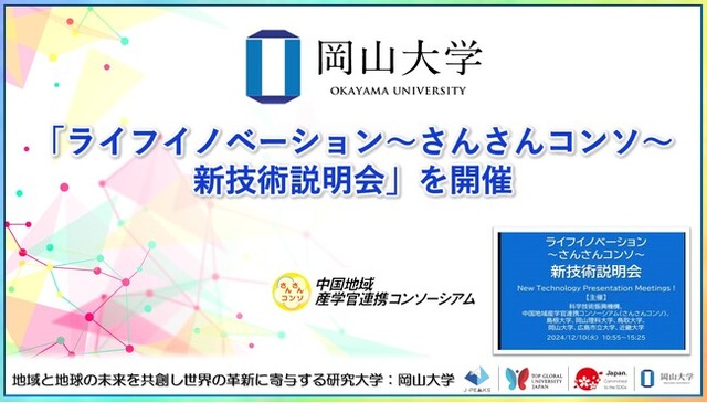 国立大学法人岡山大学(本部:岡山市北区、学長:那須保友)は2024年12月10日、鳥取大学とともに事務局を務める、中国地域産学官連携コンソーシアム(さんさんコンソ)主催による「ライフイノベーション~さんさんコンソ~新技術説明会」をオンラインで開催し、延べ605人が参加しました。本説明会では、さんさんコンソ連携校の島根大学、岡山理科大学、鳥取大学、岡山大学、広島市立大学、近畿大学から7人が、最新の研究成果を発表しました。