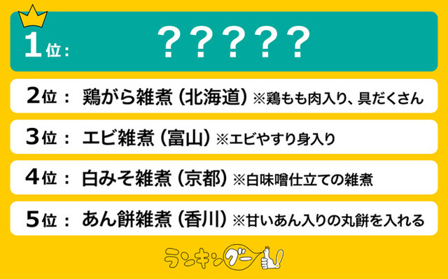 ランキングー!では食べてみたい地域別のお雑煮をピックアップし、ランキングを調査。全年代の男女(性別回答しないを含む)9,490名にアンケートを行い、TOP20を決定しました。ここではTOP5をご紹介します。