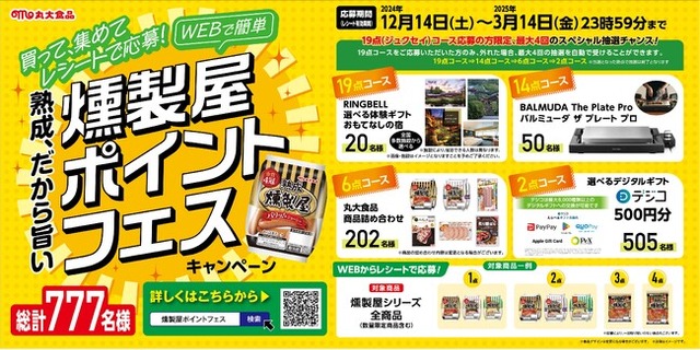 丸大食品株式会社(本社:大阪府高槻市、社長:佐藤勇二)は、2024年12月14日(土)から2025年3月14日(金)まで、当社主力ブランド「燻製屋」をより多くの方々に味わっていただきたいという思いから、ポイントを集めて応募できるクローズド懸賞「燻製屋ポイントフェスキャンペーン」を実施いたします。