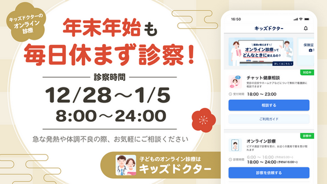 年末年始は救急病院なども稼働が逼迫することが予想されます。ご自宅からご受診いただける「キッズドクター」のオンライン診療をぜひご活用ください。全国からご受診いただけるため、帰省や旅行先での急な体調不良のときにもご利用いただけます。また子どもだけでなく、大人の方もご受診いただけます。