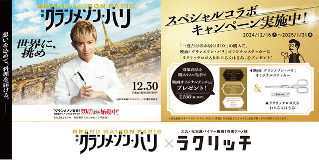 2024年12月16日(月)~2025年1月31日(金)のキャンペーン期間中、一度だけのお届けBOXご購入の先着150個(BOX)に映画『グランメゾン・パリ』オリジナルステッカーとラクリッチロゴ入り「れとらくはさみ」をプレゼント。冷凍グルメ便が気になっている方、既にご利用いただいている方も、是非この機会にラクリッチをお楽しみください。