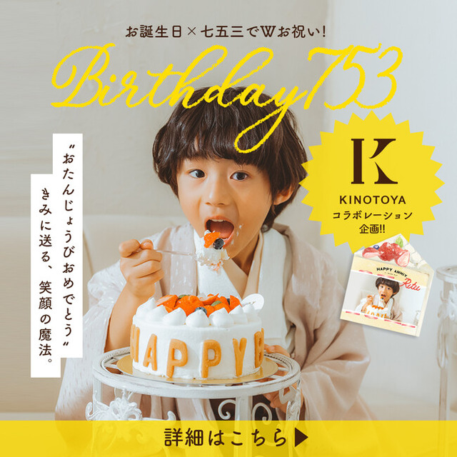 Paletteの人気企画、お誕生日と七五三のW記念をお祝いする「バースデー七五三」。お誕生日の3週間以内に撮影する方には、オリジナル衣装の追加料金無料などのプレゼントがもらえます。