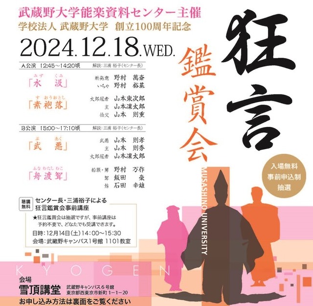 武蔵野大学能楽資料センター(センター長:三浦 裕子)は12月18日(水)に武蔵野大学武蔵野キャンパス雪頂講堂で狂言鑑賞会を開催します。