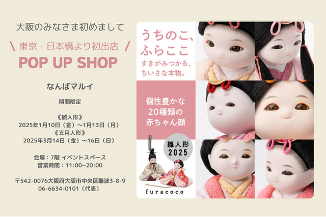 小さくかわいい赤ちゃん顔の雛人形や五月人形づくりのリーディングカンパニーである人形工房ふらここは、2008年に創業以来、Web限定で販売してまいりましたが、子供が生まれたばかりのママの支持を得て、累計販売数は5万5千セットを突破いたしました。今回は、関西地方にお住いのお客さまのご要望にお応えして、2025年1月10日(金)~13日(月)の期間限定で、大阪初のPOP UP SHOPをなんばマルイ7階イベントスペースにてオープンいたします。