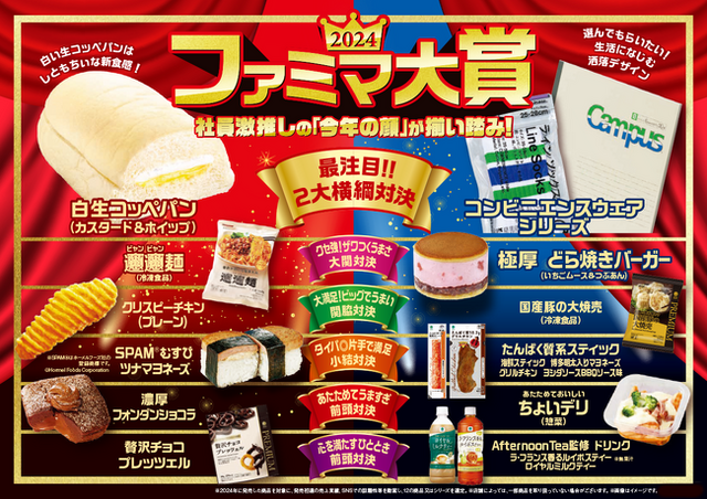 今年の「ファミマ大賞2024」は、2024年に新規・リニューアル発売された商品の中から、新規性・話題性・売上をもとに、ファミリーマート社員が選んだ一番おすすめしたい商品を東西番付になぞらえて「横綱、大関、関脇、小結、前頭」に分けて発表いたします。ノミネートされた商品開発担当者のこだわりコメントとともにお楽しみください。