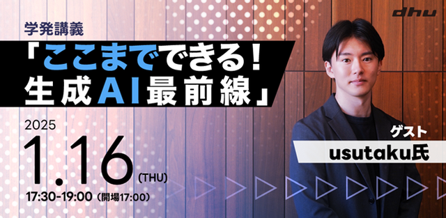 文部科学省認可の株式会社立の大学として、デジタルコンテンツと企画・コミュニケーションを学ぶデジタルコミュニケーション学部(4年制大学)と、理論と実務を架橋し新たなビジネスを生み出すデジタルコンテンツ研究科(専門職大学院)を設置するデジタルハリウッド大学(DHU、所在地 東京・御茶ノ水、学長 杉山知之)では、学発講義として、AI研修を提供するMichikusa株式会社CEOのusutaku氏をお招きし生成AIの最前線を学べる回を公開講義として開催します。今回の企画は、本学在学生の上杉さん、江田さんが発起人となり大学側へ企画を提案し実現しました。生成AI発信者でフォロワー数日本1位のusutaku氏の、今1番アツいAIツールを複数紹介します。