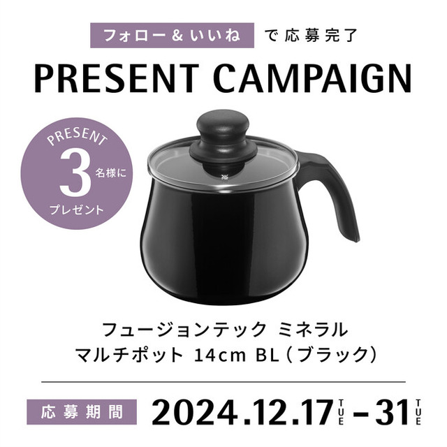 WMF公式インスタグラムアカウント(@wmf_japan)をフォローし、キャンペーン投稿に「いいね!」をしていただいた方の中から抽選で「フュージョンテック ミネラル マルチポット 14cm BL(ブラック)」を3名様にプレゼントいたします。